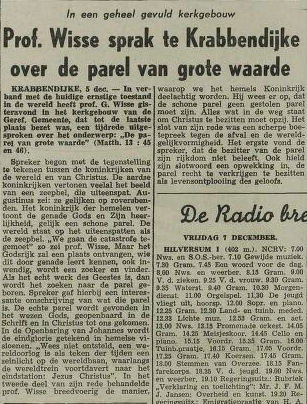 Eén van de bezinnende activiteiten van de verschillende kiesverenigingen is het organiseren van een Tijdrede; men nodigt een spreker uit, meestal een predikant, die aan de hand van een Bijbelgedeelte stilstaat bij de tijdsomstandigheden. Woensdagavond 5 december 1956 is het druk bij en in het kerkgebouw van de Gereformeerde Gemeente te Krabbendijke, er wordt deze avond een Tijdrede uitgesproken door de Christelijke Gereformeerde hoogleraar G. Wisse, in die tijd een veel gevraagd tijdredenaar. Die avond spreekt hij over: ‘De Parel van grote waarde’. In het Zeeuwsch Dagblad van 6 december lezen we een verslag.